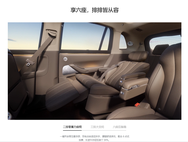 从座椅布局上看,5座版采用2+3布局,依托5080mm车长与3030mm轴距,后排空间充裕,后备箱常规容积957L,放倒二排可拓展至2252L的更大储物空间,适合人口较少家庭或注重载物需求的用户;6座版为2+2+2布局,第二排配备独立座椅,右侧标配零重力座椅,兼顾舒适性与尊贵感,可满足多人口家庭出行,后备箱常规容积333L,放倒三排可拓展至1157L,仅满员状态下后备箱容积略逊于5座版。