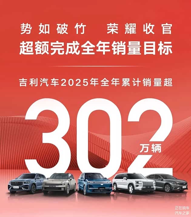 2025年,吉利汽车累计销量突破302万台,同比增长39%。