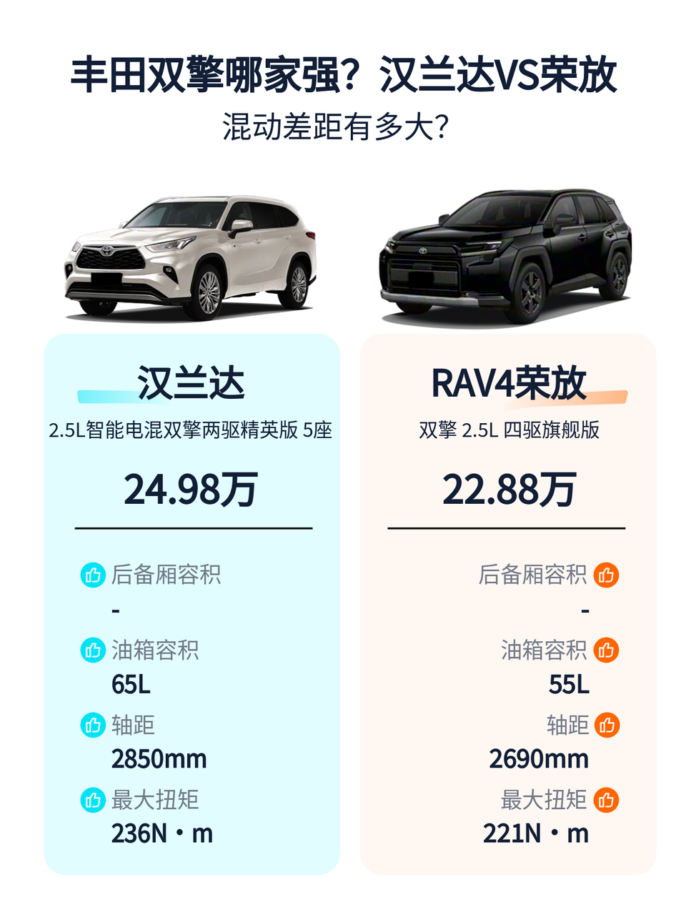 同样丰田混动,汉兰达和RAV4差距在哪?🚗 二胎奶爸的痛谁懂?周末露营装备+婴儿车塞不进后备箱,RAV4荣放放倒座椅才勉强够用…汉兰达车主却笑而不语! 实测对比来了👇 ✅空间: 汉兰达五座后备箱2000L👉婴儿车+帐篷+烧烤架轻松装 RAV4荣放580L👉放倒座椅才够用,后排腿部空间局促 ❗奶爸选汉兰达,单身选RAV4 ✅油耗: 汉兰达WLTC 5.82L/百km👉实测一箱油跑900km+ RAV4荣放5.23L/百km👉油箱小续航反而不如汉兰达 ⛽长途选汉兰达,通勤选RAV4 ✅配置: RAV4荣放四驱旗舰版👉360影像+电尾门+全景天窗 汉兰达精英版👉倒车影像+手动座椅但标配L2辅助 📌要面子选RAV4,要实用选汉兰达 所以问题来了:预算25万,你是选高配RAV4还是低配汉兰达?评论区见!