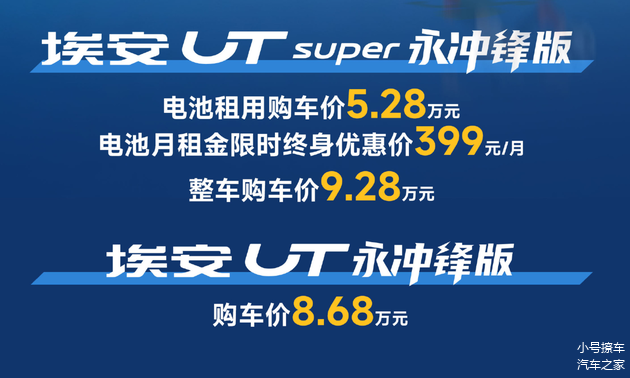 日前,埃安品牌官方宣布,旗下的埃安UT系列永冲锋版上市,电池租用购车价为5.28万元,整车购车价为9.28万元。而且新车还提供有非换电版本可选,官方指导价为8.68万元。