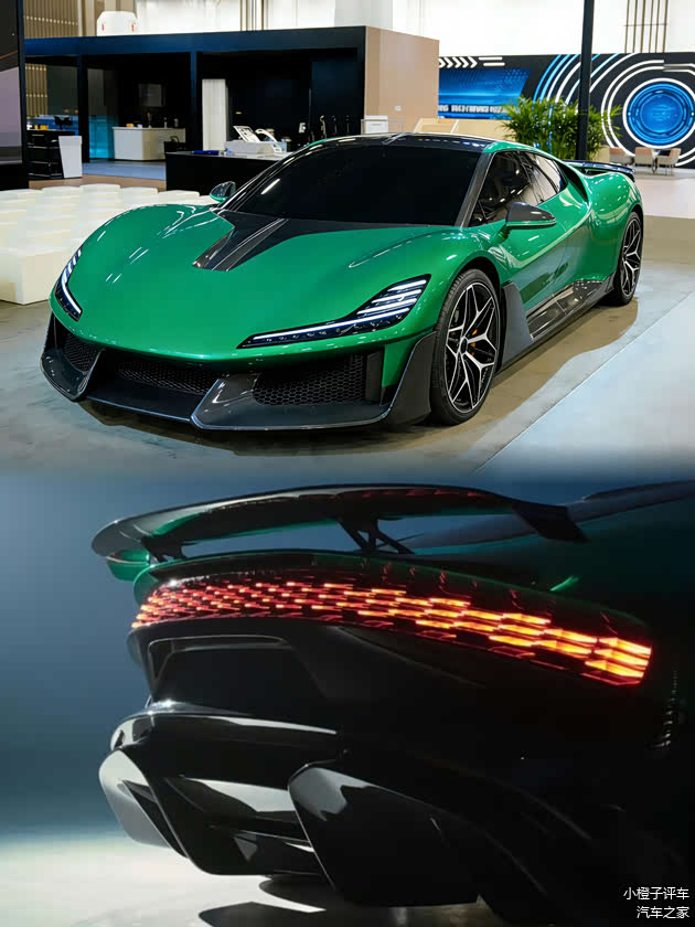 新车速评:追觅造车品牌分为星宸未来与星空计划,而这台绿色涂装的超跑就属于星空计划旗下,整车外观设计语言与布加迪Brouillard如出一辙,尤其是头尾灯的造型与车身轮廓,同时采用大量超刚性深编织碳纤维套件,大尾翼与底部的扩散器也很吸睛。动力上搭载四电机,综合马力高达1876Ps,零百加速仅需1.8秒,同时还会搭载线控转向技术,计划于2027年实现量产。