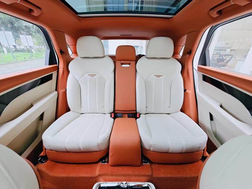 配置:【选配】 1. 反衬色宾利徽章刺绣 2. 4+1舒适座椅配置 3. 3辐式双色加热真皮镶边方向盘 4. 黑钢琴木面板 5. 后门电动关闭 6. 颜色配置 7. 21英寸五双辐铝合金黑色机械切割轮毂 8. 中控台细条纹木饰面-浅色人字形花纹(PCG MVE6) 9. 自正式轮毂中心盖。