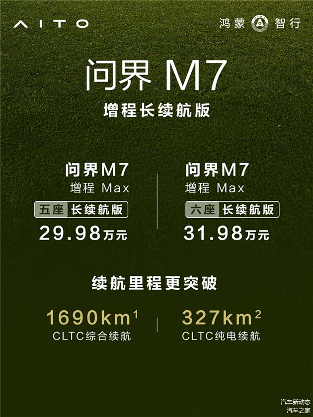 全新问界M7增程长续航版也于当天宣布正式上市,并开启大定。新车推出两款配置:增程Max五座长续航版售价29.98万元,增程Max六座长续航版售价31.98万元。为回馈用户,即刻下定可享受至高60000元的丰厚购车权益。