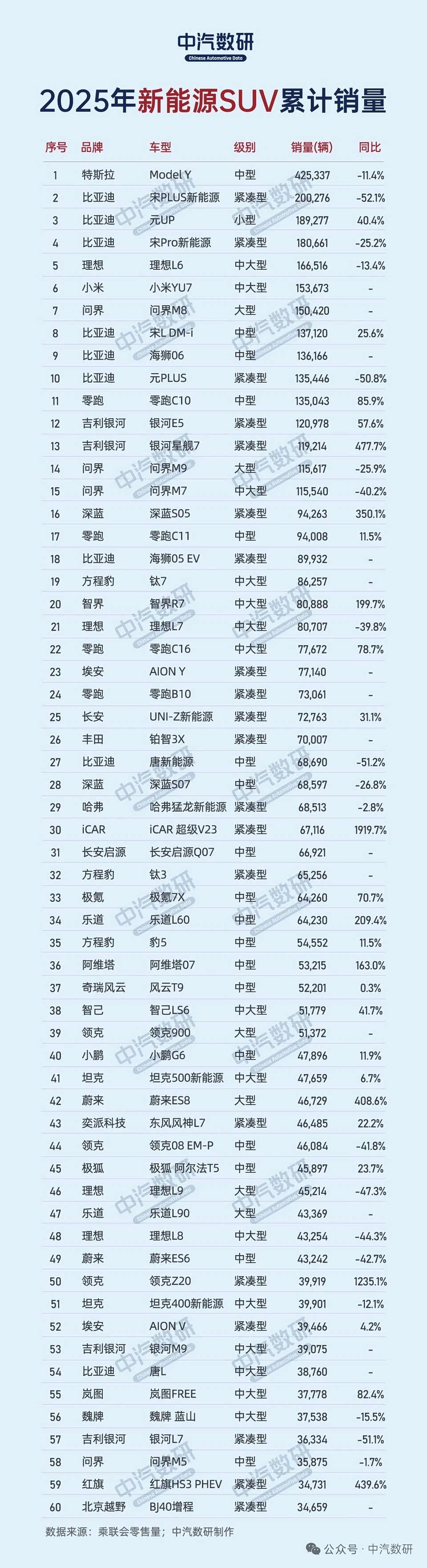 前10名中,有6款比亚迪,其中宋PLUS 20万辆,是比亚迪最畅销的SUV。2026年,比亚迪的目标或超过500万辆,海外市场是其销量的核心突破口之一。 特斯拉Model Y,42.5万辆,再考虑到售价,可以说是断崖式领先。虽然被评价为毛坯房,小板凳,但是消费者就是认可,好开,也没有解释成本。 理想L6,16.7万辆,理想汽车的销量担当。今年理想汽车的压力是比较大的,期待2026年的全新换代。 小米YU7,15.4万辆,这台车也不用评价了,排队待产的车型。不过今年小米汽车的负面舆论挺多,期待小米今年的大型SUV。 问界M8,30多万的售价,断崖式领先。