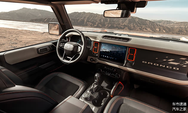 2026款福特烈马的内饰与外观设计一样,有着浓郁的硬派越野车的气息,车内采用了大量横平竖直的线条加以点缀,支撑性不错的座椅,多功能方向盘,硬朗的空调出风口等,既注重实用性也有着明显的硬派感。内嵌式的中控屏,也显示出一定的科技感。