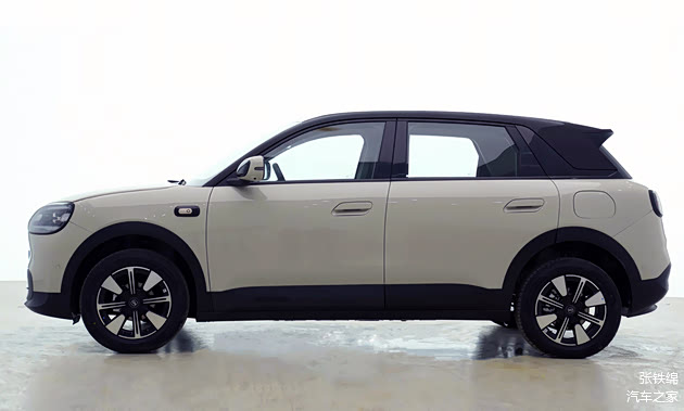 车身侧面造型简洁干练,车顶使用了黑色涂装,双色涂装的后视镜很卡通,车门把手为半隐藏式,下包围使用了黑色涂装。尺寸方面,新车长宽高分别为4195/1811/1569mm,轴距2700mm。