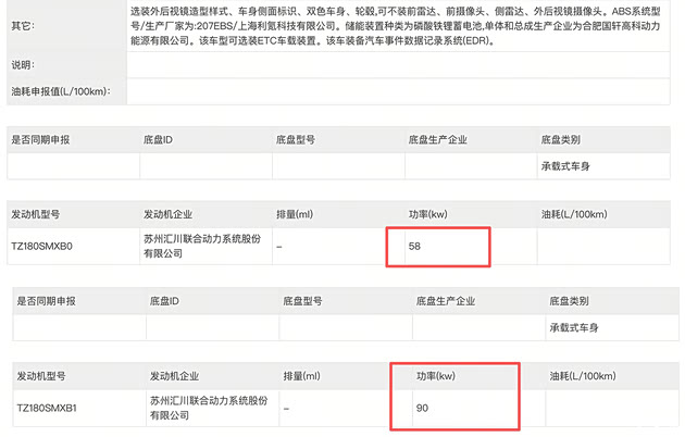 动力部分,根据申报信息显示,新车将会提供两种电机,最大功率分别为58千瓦和90千瓦,匹配的是国轩高科的磷酸铁锂电池组。