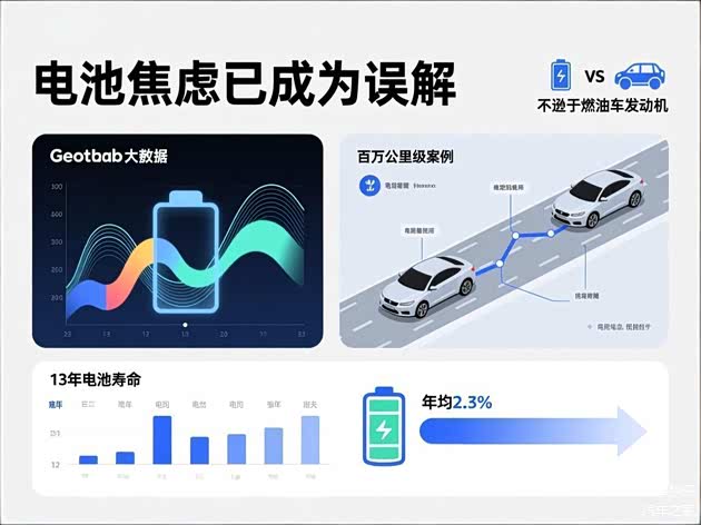 从Geotab的22700辆车大数据,到百万公里级的真实案例,都在证明:电动车电池寿命可达13年,年均2.3%的衰减率完全可控,耐用性已不逊于燃油车发动机。此前的“电池焦虑”,更多是早期技术认知和个别案例引发的误解。