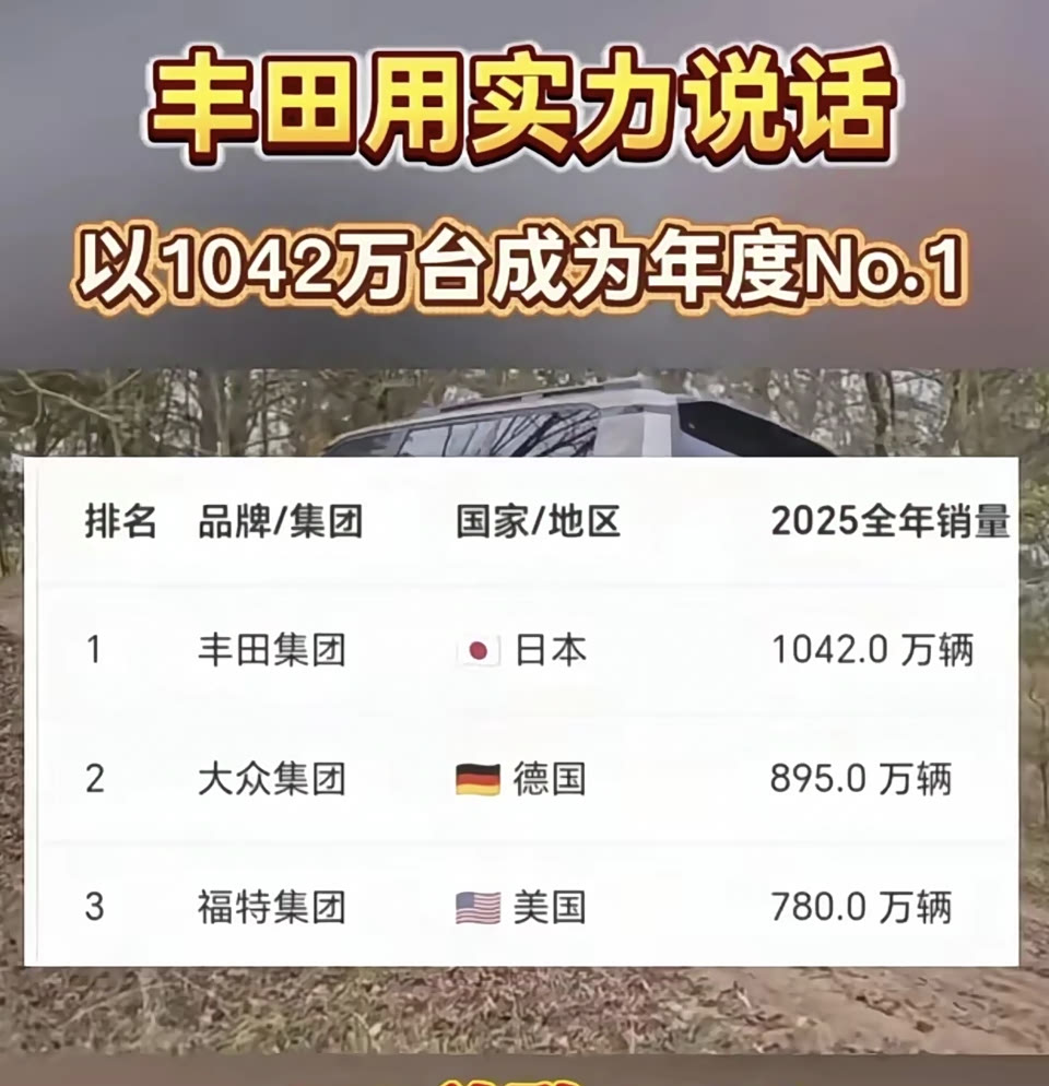 丰田遥遥2025年全球销量又是第一,卖了1042万辆,比比亚迪多了一倍多。