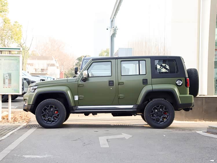 侧面造型笔直有力,车身尺寸为4630/1925/1871毫米,轴距为2745毫米。车尾采用经典的外挂式备胎以及侧开门的设计,还拥有快拆车顶设计,拥有丰富改装空间。新车还拥有37°接近角、31°离去角、23°通过角、220mm最小离地间隙、750mm涉水深度,通过性出色,并且还标配2.5T拖技资质。