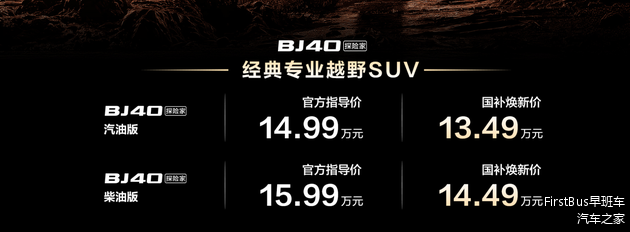 【新车上市】日前, 北京越野BJ40探险家正式上市,新车提供汽油版和柴油版,指导价分别为14.99万元、15.99万元,国补焕新价为13.49万元和14.49万元。动力方面,搭载2.0T汽油以及2.0T柴油发动机,均匹配采埃孚8AT变速箱。