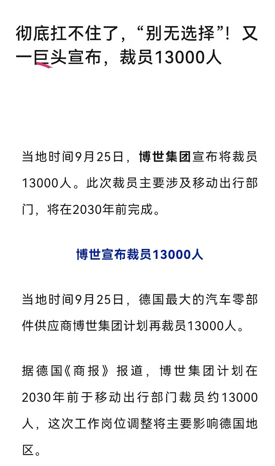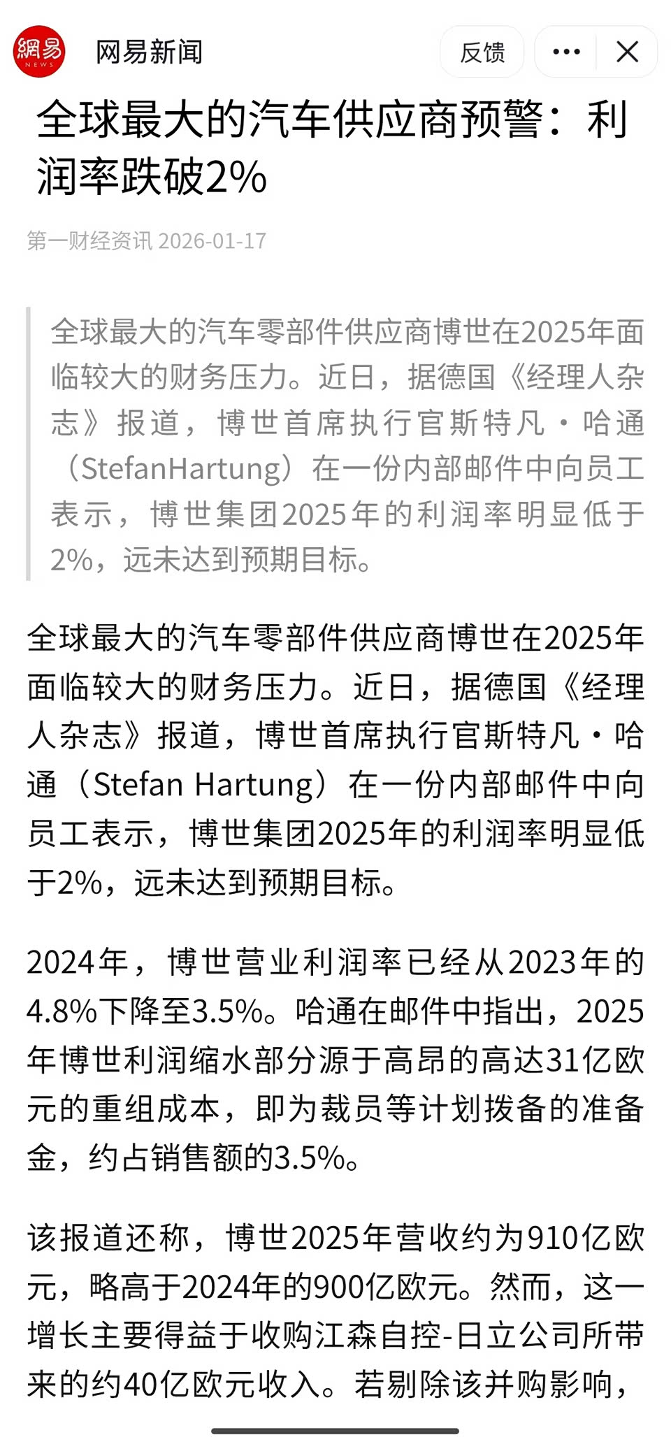 我的天!全球最大的汽车零部件供应商利润率都不到2%,博世都要面临财务压力,其他汽车供应商怎么活啊?!估计要全球大裁员了……据说已经连降3年了,2023年4.8%。2024年3.5%,去年都不到2%,博世2025年营收约为910亿欧元,虽然比2024高点,但是去年花了高达31亿欧元进行重组,就是为裁员拨备的准备金,博世计划2030年前削减1.3万个工作岗位。