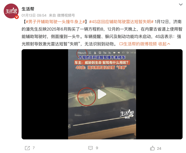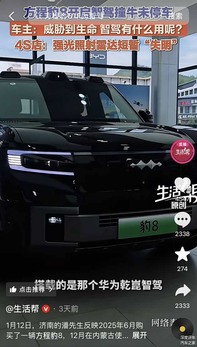 【文/深度评车&财经三剑客】1月12日,济南的潘先生反映2025年6月购买了一辆方程豹 豹8,12月在内蒙古使用智能辅助驾驶时,侧面撞到牛身上。车辆提醒、躲闪及制动功能都没有启动,4S店表示:强光照射激光雷达导致短暂“失明”,动物识别不出来。