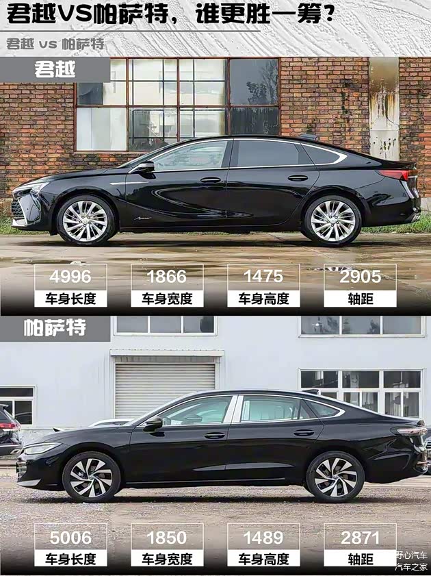 君越的鲨鱼前脸+贯穿尾灯简直气场全开,5米车长配溜背造型,停在帕萨特旁边明显更显贵气✨ 特别是艾维亚专属的19寸轮毂,比帕萨特18寸的更有视觉冲击力。不过帕萨特的星空前脸确实年轻化不少,黑色车漆洗完自带商务buff。