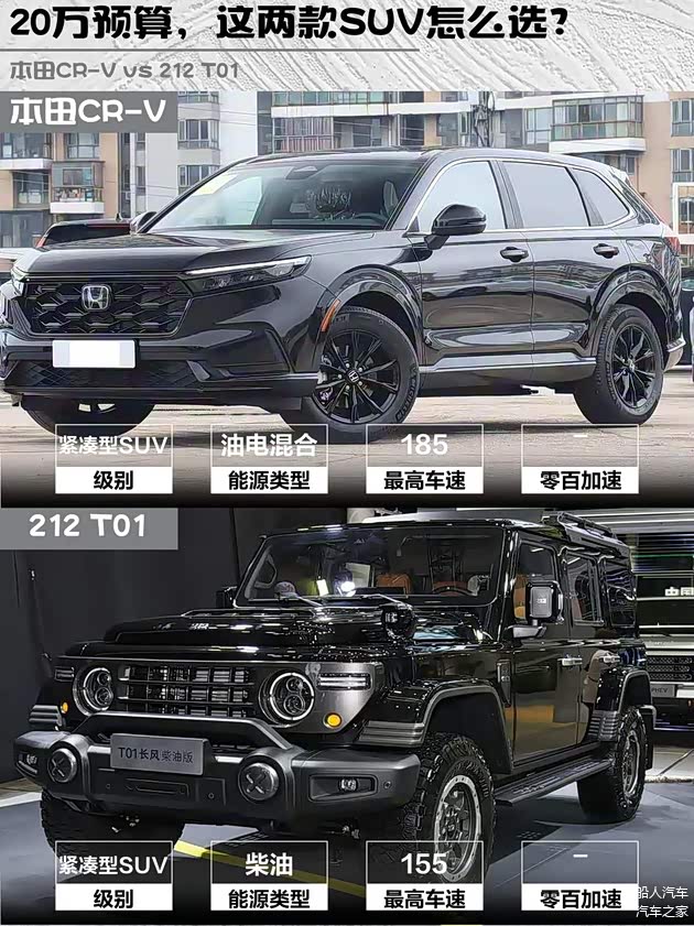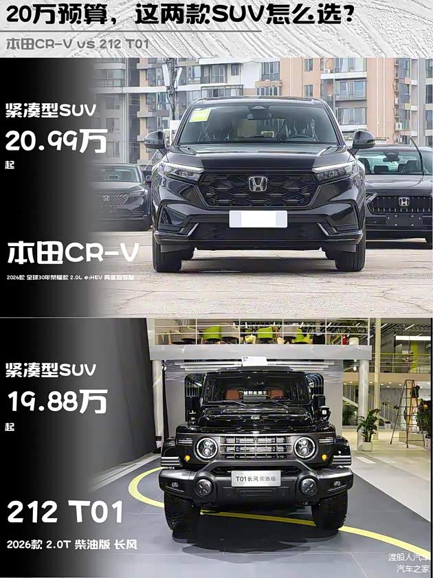 最近在纠结20万级SUV选家用还是越野?深度对比了本田CR-V 2026款全球30年荣耀款2.0L e:HEV和 212 T01 2026款2.0T柴油版长风,这两台性格截然不同的车简直像文科生和体育生的对决!🚗💨