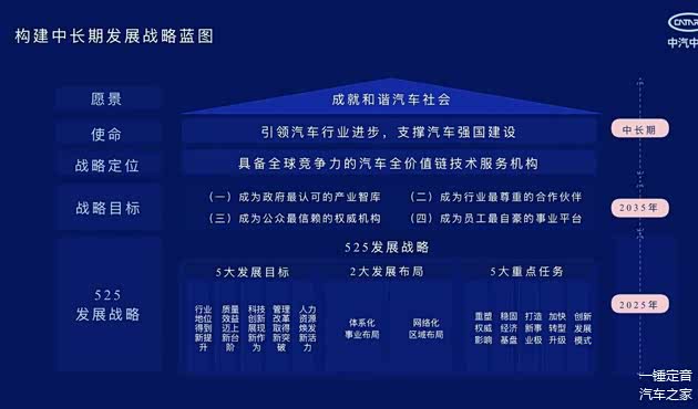 中汽中心的企业愿景是:成就和谐汽车社会。企业使命是:引领汽车行业进步,支撑汽车强国建设。四大战略目标是:成为政府最认可的行业智库、成为行业最尊重的合作伙伴、成为公众最信赖的权威机构、成为员工最自豪的事业平台。