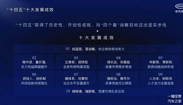 中汽中心战略规划与科技创新部部长朱向雷介绍了中汽中心“十四五”十大发展成效,主要有十个方面:一是央企使命担当有力、二是实力效益跨越提升、三是业务布局构建成型、四是发展布局稳步推进、五是新质动能加快形成、六是科技创新持续强化、七是治企水平全面提升、八是改革效能充分释放、九是人才活力全面迸发、十是党建引领扎实见效。