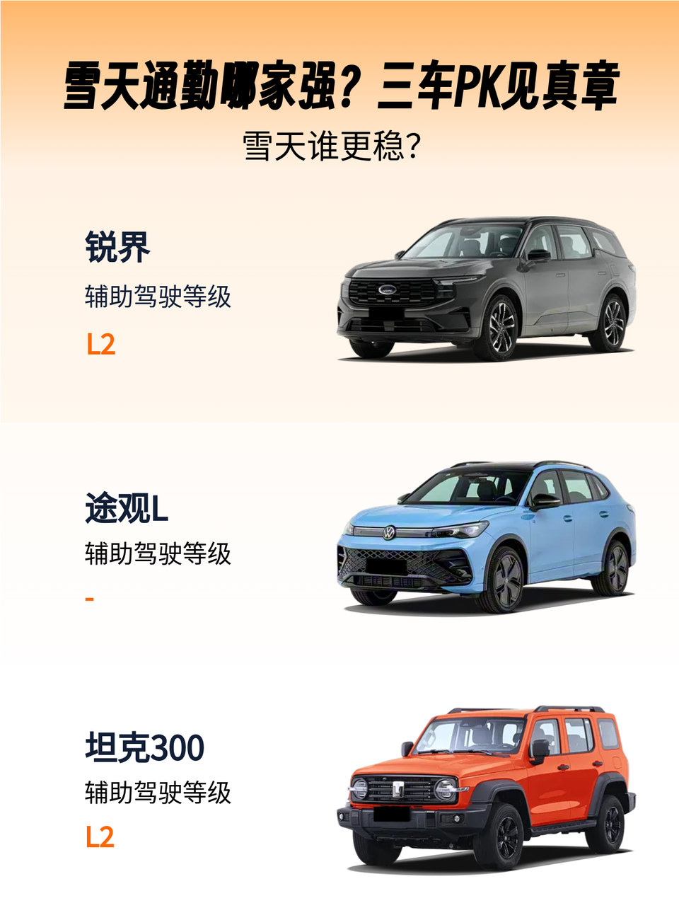 A:城市通勤选锐界L(稳+省心),偶尔越野选坦克300(四驱加持),纯代步途观L(油耗最低)