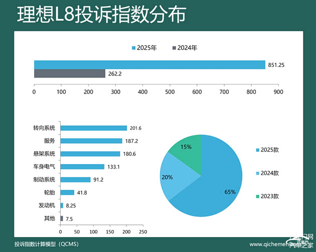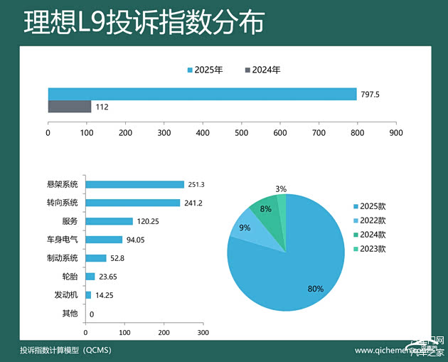 汽车质量投诉点评:2025年,理想L9的投诉指数达到了797.5,同比涨超6倍,下摆臂异响和新车降价的问题同样出现在该车上。有车主投诉称,车辆在低速行驶时(<30km/h)底盘前部发出“咯吱咯吱”金属摩擦声或橡胶挤压声。此外,理想汽车去年10月发布的大额保险补贴政策也包含了理想L9,该车叠加补贴后直降4.5万元,此举被老车主大量吐槽。