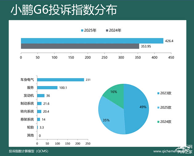 汽车质量投诉点评:去年,小鹏G6投诉指数同比上涨了20%,车身共振、驾驶辅助故障、转向失灵成为投诉原因。多位车主投诉称,车辆参与小鹏汽车“免费更换舒适避震”的活动后,就出现了低频噪音的问题,开车的时候感觉“很难受”。驾驶辅助故障也遭到车主投诉,主要集中在2023款车型上。另外,小鹏G6还存在转向失灵的情况。有车主投诉,车辆在行驶时突发双冗余系统全面崩溃,电动助力转向(EPS)完全锁死,方向盘无法转动,同步出现电子制动系统(ESP)失效,刹车踏板无助力,车机报警“动力系统故障、转向系统异常”。