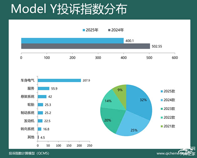 汽车质量投诉点评:去年,Model Y的投诉指数同比下滑了20%。从投诉反馈来看,座椅故障、车身生锈、驾驶辅助故障遭到了车主的投诉。这其中,座椅故障具体表现为副驾驶头枕暴晒表层出油、鼓包起泡、座椅皮革出现凸点等。车身生锈则体现在后备箱内侧、底盘衬套、后排地板钣金处等。此外,驾驶辅助故障也遭到车主投诉。值得一提的是,这三大问题投诉量并不高,占比13%。