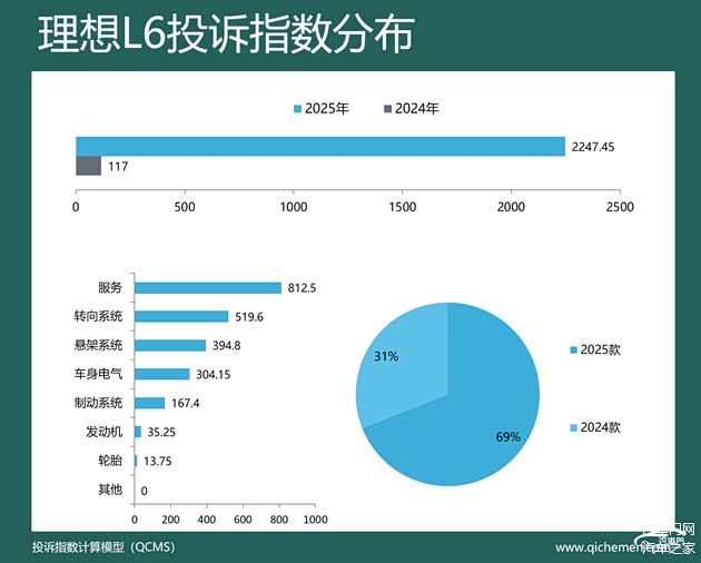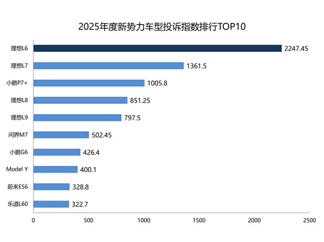 汽车质量投诉点评:去年,理想L6的投诉指数同比涨超18倍,下摆臂异响和新车降价成为车主投诉的主要原因。2025年7月,理想L系列智能焕新版被曝出存在转向异响、刹车异响的系统性事件。多位车主反映,新车落地不久后便出现异响,更换下摆臂后依然存在。面对车主的投诉,官方解释称“新型液压衬套油脂在高温下粘度变化导致的偶发噪音”,并强调“不影响车辆安全”。异响风波过后,理想L6又因调整购车优惠政策被老车主认为是变相降价从而遭到投诉。