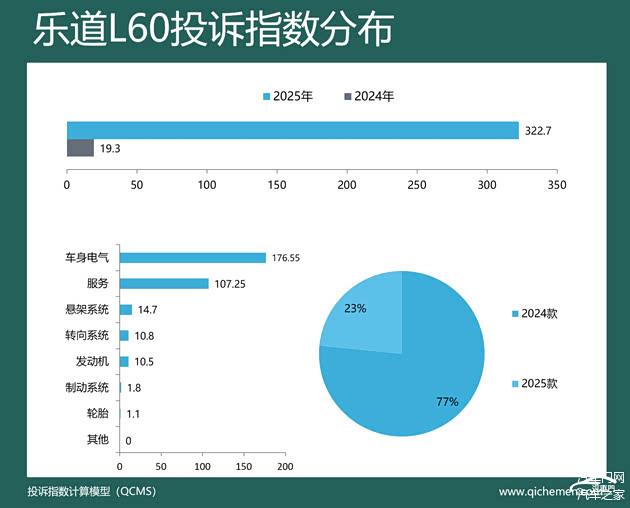 汽车质量投诉点评:2025年,乐道L60的投诉指数同比涨超15倍,经销商不退订金、部件开裂、座椅故障、驾驶辅助故障是车主投诉的主要原因。有车主投诉称,购车时销售承诺贷款不通过可退订金,但真当事情发生时又拒绝退款。部件开裂则主要表现为玻璃天幕有条纹,2024款和2025款均有涉及。座椅故障和驾驶辅助故障也遭到车主投诉,但整体投诉量并不高。