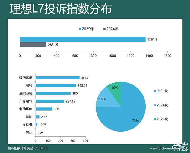 汽车质量投诉点评:2025年,理想L7的投诉指数达到了1361.5,同比涨超3倍,下摆臂异响和新车降价的问题也同样在该车上存在。从投诉反馈来看,有关下摆臂异响的投诉指数达到了683.9,占比50%。有车主投诉称,理想L7智能焕新版仅在提车两周后底盘便出现异响声。此外,新车降价也遭到车主投诉,占比17%。