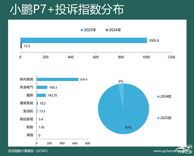 汽车质量投诉点评:过去的一年,小鹏P7+的投诉指数达到了1005.8,同比涨超81倍。这背后,转向机线束裸露成了罪魁祸首。从投诉反馈来看,该问题集中在2024款车型上。多位车主反映,老款P7+转向机设计简陋,其中部分线束裸露在外很容易进水造成转向失灵等问题,而在新款车型相关部件已经优化了设计,不存在安全风险。面对投诉,官方于去年9月宣布召回,为问题车辆免费更换改进后的转向机总成。