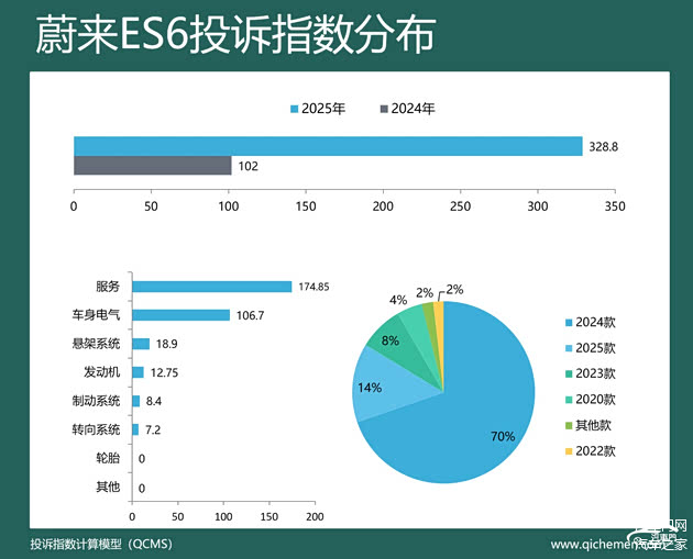 汽车质量投诉点评:2025年,蔚来ES6的投诉指数同比涨超2倍,新车降价和驾驶辅助故障遭到车主投诉。从投诉反馈来看,新车降价问题主要集中在2024款车型上。有车主投诉称,4S店销售以“清仓绝版”、“价格洼地”、“抄底好时机”、“新款必涨价”等诱导购车,隐瞒2025款全面升级且价格更低的事实。驾驶辅助故障也是车主投诉的对象,具体表现为自动泊车故障、AEB失效、短期内激光雷达损坏等问题。