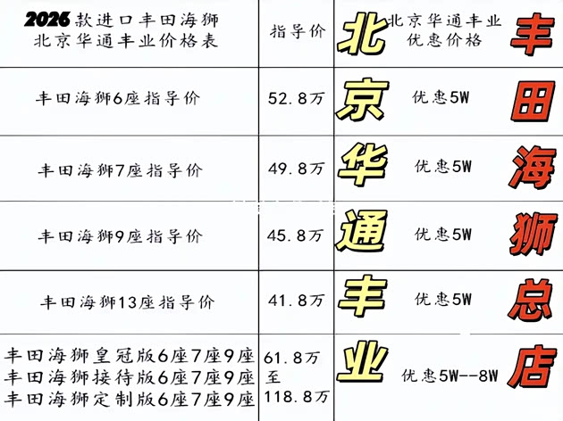 打造“移动总裁办公室”或“家庭豪华房车”。第三排座椅可整体拆卸,实现“客货两用”,满足多样化的使用场景。2026款丰田海狮6座凯撒皇冠版以其卓越的品质、奢华的配置和灵活的空间布局,成为了高端出行领域的佼佼者。