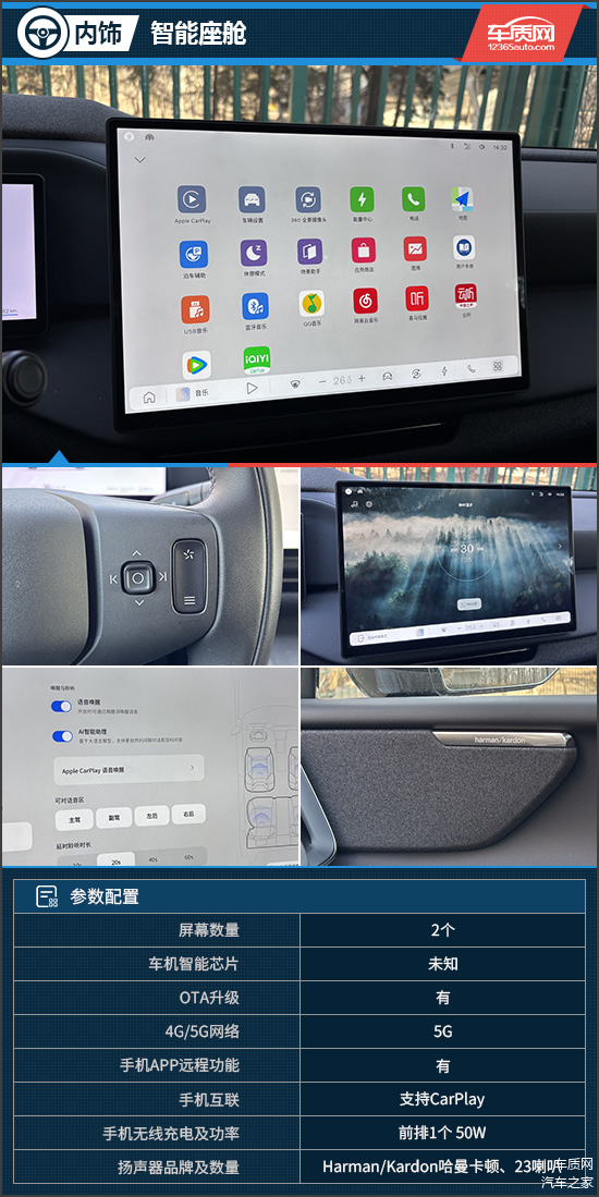 评测车配备15.4英寸中控屏,显示效果细腻,配合12.3英寸全液晶仪表和92英寸AR-HUD增强现实抬头显示,信息显示足够直观。全新车机UI设计逻辑清晰、操作流畅,上手难度不高。系统自带丰富的第三方应用,并具有四区域语音唤醒识别、可见即可说等功能,智能化水平达到行业主流水准。内置的场景助手拥有多种预设模式,可一键切换专属舒适空间,还支持用户自定义。此外,评测车还搭载了带有23个扬声器的Harman/Kardon哈曼卡顿音响,可带来沉浸式的听觉体验。