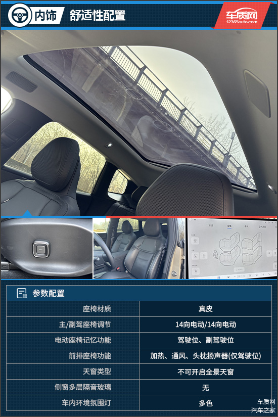 舒适性配置方面,评测车配备不可开启全景天窗,并提供电动遮阳帘,兼顾座舱通透感与防晒需求。前排座椅支持加热、通风,驾驶位还配备头枕扬声器,配合柔软的填充物以及电动腿托,乘坐舒适性与身体支撑性表现到位。此外,方向盘及后排座椅均支持加热功能,对全车乘员的照顾较为周到。