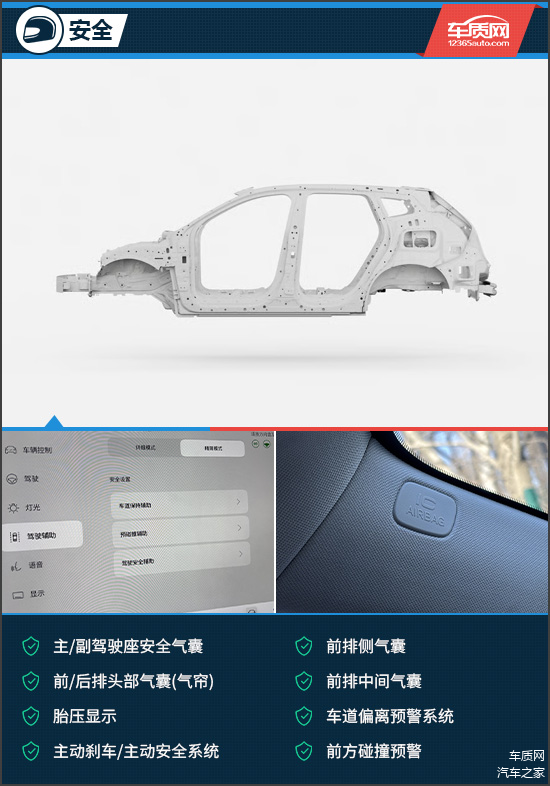 安全配置方面,评测车搭载了较为全面的主/被动安全配置。主/副驾驶座安全气囊、前排中间气囊、车道偏离预警系统、前方碰撞预警等均有配备,可有效提升行车安全性。此外,其采用高强度笼式车身结构,可在侧面碰撞时分散冲击力,并配合安全气囊与气帘降低乘员受力。座椅造型针对追尾工况进行了优化设计,有助于减轻颈部损伤风险。