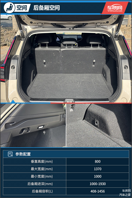 后备厢内部空间规整,根据官方数据显示,标准状态下容积为408L;放倒座椅后,容积可扩展至1456L,装载能力较为出色。此外,其内部还配备了12V电源、挂钩等实用配置,地板下方还提供了存放置物帘的空间,方便收纳。