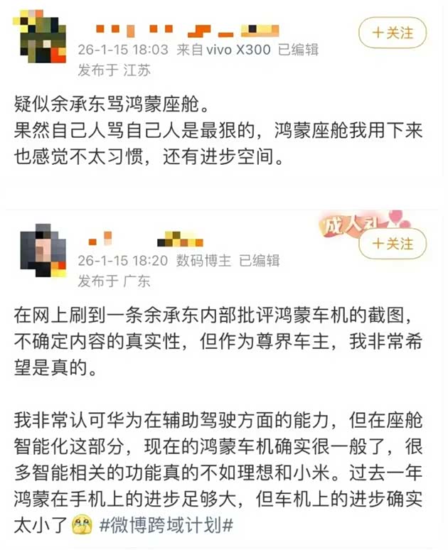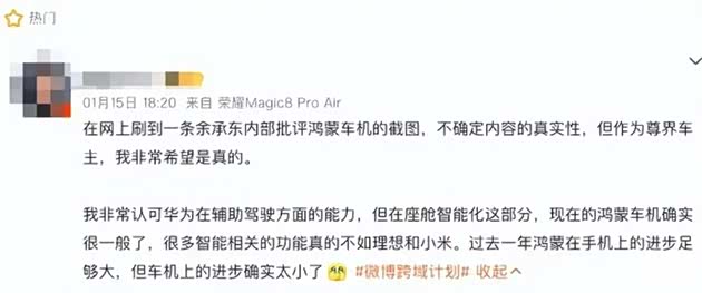 最后,我们还是返回余承东“发飙”的关键,那便是鸿蒙座舱在智能化上确实在一些方面跟不上友商。比如有网友吐槽:相比其他车企在语音交互、场景化服务上的快速迭代,鸿蒙座舱的升级节奏显得有些缓慢,最近的更新也多集中在朝霞渲染、3D路名这类视觉层面的优化,缺乏颠覆性的智能功能突破。