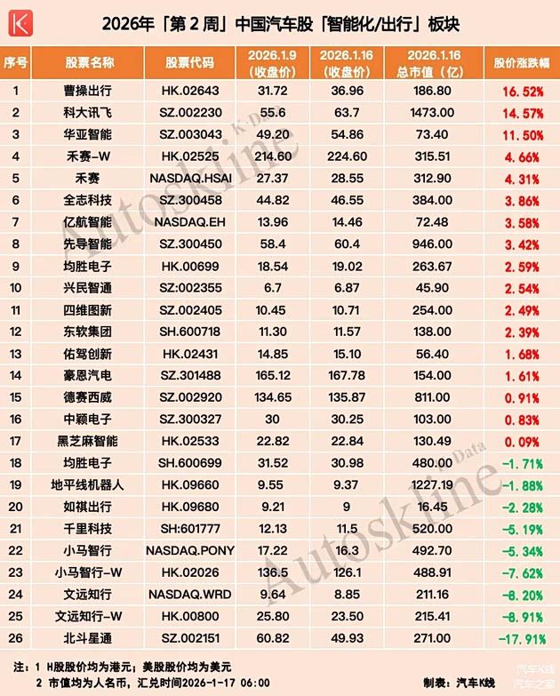 总榜涨幅第2的曹操出行,周涨16.52%,在智能化/出行板块位居榜首。