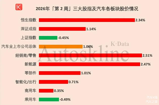 2026年第2周,汽车股六大板块中,唯乘用车板块出现下跌,平均跌幅0.49%,表现拉胯。