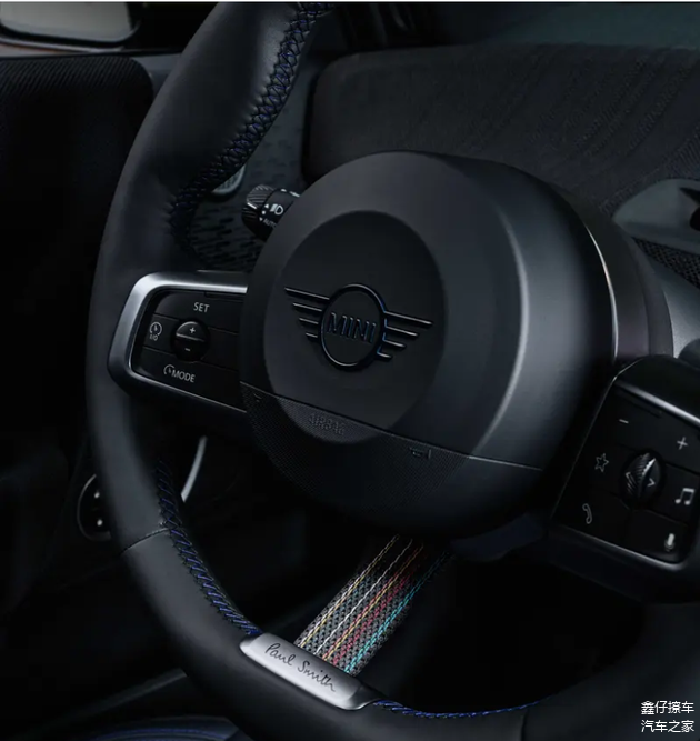 通过三种车身颜色与两种Paul Smith专属定制车顶的组合方式,电动MINI COOPER PAUL SMITH设计师款共形成六种外观配色方案。这种组合逻辑并未增加选装复杂度,而是在有限配置范围内提升差异化选择空间,既满足个性化需求,又避免了选装成本失控。从导购视角看,这种组合方式有助于用户在预算范围内完成风格定制。作为Paul Smith最具识别度的设计符号,彩色条纹在该车型上被多处应用,但整体呈现方式保持克制。驾驶员侧车顶上的彩色条纹装饰,并未采用大面积铺陈,而是以细节方式出现,在日常使用中不会造成视觉疲劳。方向盘上的10色编织彩条绑带,位于驾驶者低头可见区域,强化了人与车之间的专属感连接。