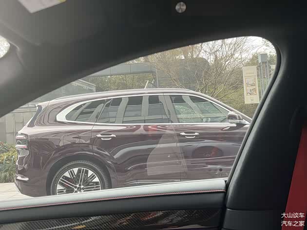 三围数据挺亮眼:长宽高分别是5100/1998/1780mm,轴距达到了3069mm。虽然比自家的9X小一圈,但放在同级里,它比问界M7、理想L8甚至宝马X5都要大。实车看起来确实体量感十足,线条饱满有力,很有肌肉感。细节上也很用心,车窗边框、门把手这些地方都用上了镀铬装饰,搭配曝光的这种暗红色车漆,高级感营造得不错。轮毂给了20到22英寸多种选择,还配了醒目的橙色刹车卡钳,电动踏板也应该会安排上,方便上下车。
