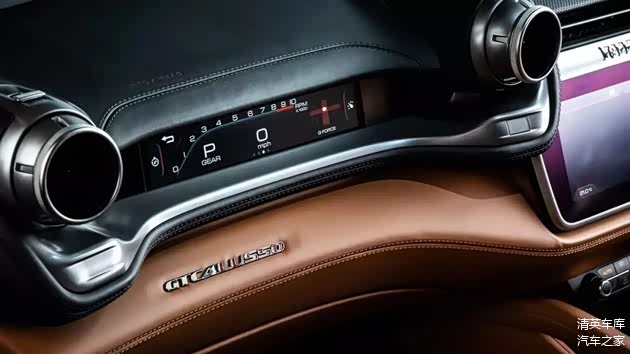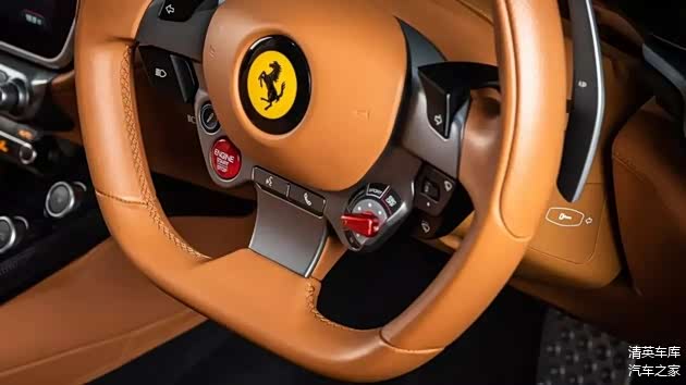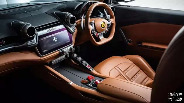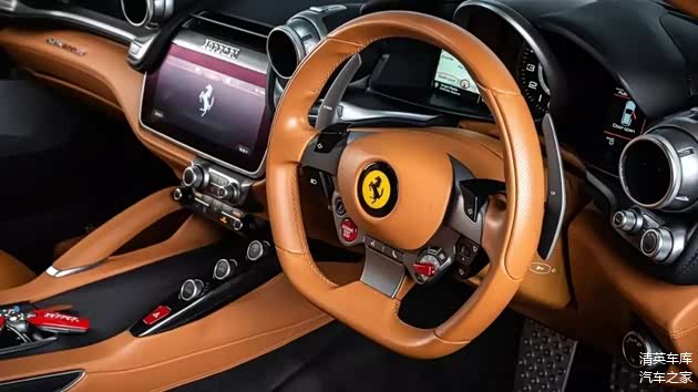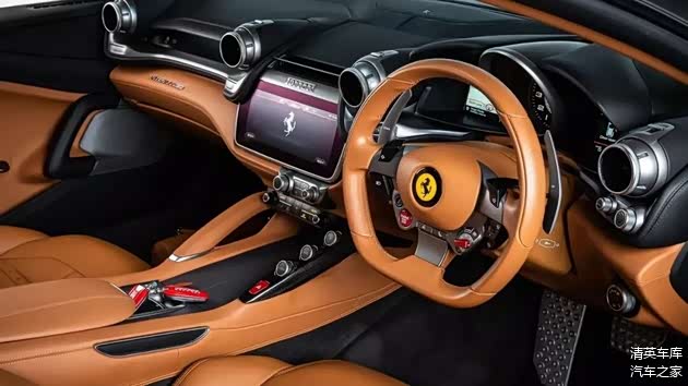 法拉利GTC4Lusso的内饰部分延续了FF的设计风格,三区域的仪表盘,圆形炮筒式空调出风口,配备了10.25英寸液晶显示屏,还可以看到配备了副驾一侧显示屏。