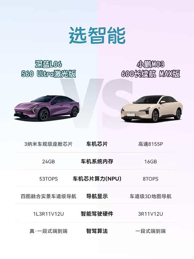 在13-15万纯电市场,消费者对智能出行的需求日益升级,辅助驾驶、续航表现与驾乘质感成为核心决策点。深蓝L06 560Ultra激光版与小鹏MONA M03 600 Max作为同级热门车型,自然成为不少用户的对比焦点。本文笔者将围绕核心产品力展开全面较量,重点解析两车辅助驾驶系统的差异,为消费者提供客观参考。