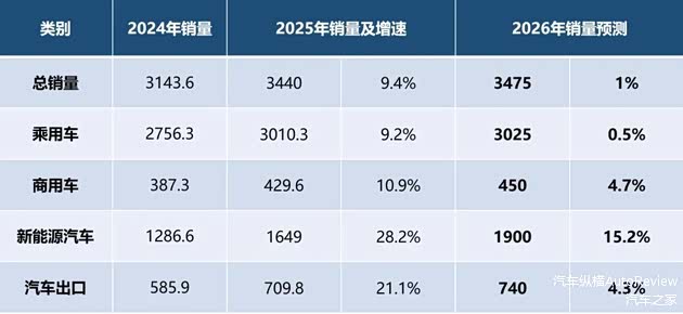 在公布2025年产销数据的同时,中国汽车工业协会还对2026年汽车市场进行了预测。据预计,2026年国产汽车总销量预计将达到3475万辆,微增1%。其中,乘用车预计为3025万辆,微增0.5%;商用车预计为450万辆,小幅增长4.7%;新能源汽车预计为1900万辆,增长15.2%;汽车出口量预计为740万辆,小幅增长4.3%。(见图表5)