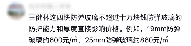 还有网友说,之前看新闻,说王健林的这款是防弹版的W12,有知道的网友吗?接着,另一位网友说的更专业,他是这样说的,王健林这四块防弹玻璃不超过十万块钱防弹玻璃的防护能力和厚度直接影响价格。例如,19mm防弹玻璃约600元/㎡,25mm防弹玻璃约860元/㎡。这句话的意思大概是说,防弹玻璃的价格跟它的防护能力和厚度有关系。比如,如果防弹玻璃的厚度是19毫米,每平方米的价格大概是600块钱,如果是25毫米厚的,价格就会涨到860块钱每平方米。所以,王健林的奥迪A8L所用的防弹玻璃价格大约在十万块钱左右。