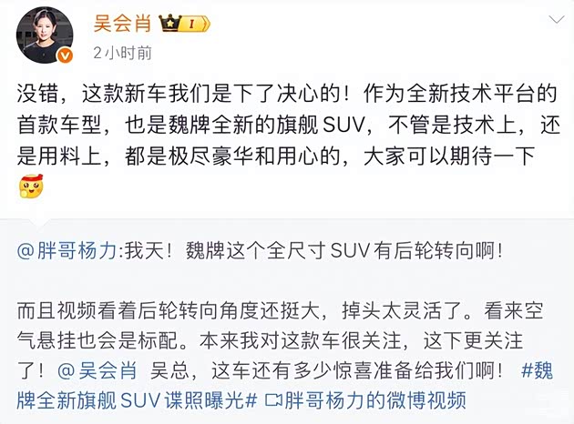 另外,从一张掉头的路试图中疑似新车使用了后轮转向技术,而这一产品点也被长城CTO吴会肖肯定,并表示除了这一技术,长城还给新车安排了猛料——标配双腔空气悬架。由此可见,长城现在的打法很直接,就是要用“堆料”来强化产品竞争力。