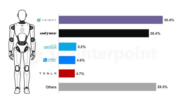 据市场调研机构CounterPoint Research最新统计数据显示,2025年全球人形机器人装机量约1.6万台,其中超80%来自中国市场,行业头部格局初显——全球装机量Top5企业,智元、宇树、优必选、乐聚强势占据四席。