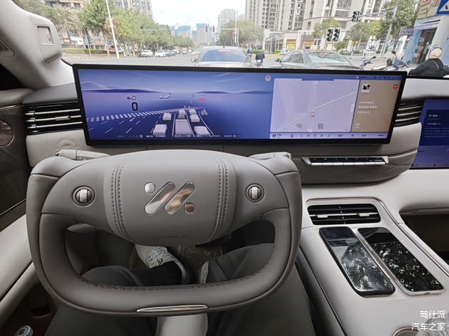 打开车门,在之前LS6的预防针之下,这内饰设计我已经比较习惯了。不过这个半幅方向盘依然让我很难评——不只因为我是一个坚定的圆形方向盘支持者,更是因为半辐方向盘让我在停车场里挪车时直接掏空了两把,给我吓出一身冷汗。还好,智己也给用户提供了一个造型很规整大气的全幅方向盘可选。