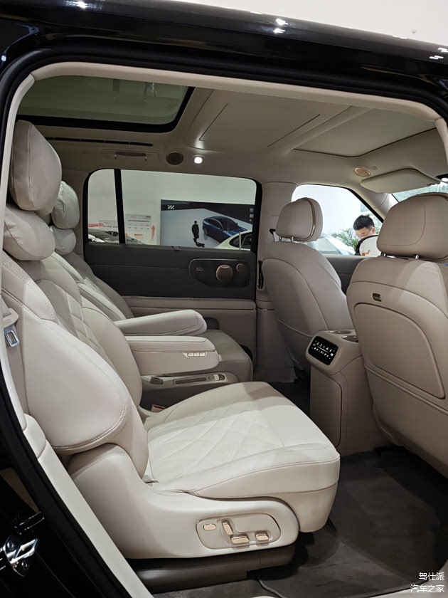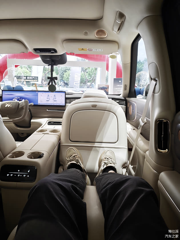 特别是在右后座上打开零重力座椅和座椅按摩,有那么一瞬间我仿佛穿越到了公司休息区的按摩椅上。不过也因此,主驾座椅就没有腰托了,实在没地儿放了。同时,座椅方面有一点比较影响内饰的高级感——二排内侧扶手的质感有点松垮,这也是此类扶手的通病了。