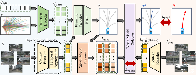 学术团队和理想团队一边打磨物理潜空间表征理论,一边拿着不断投喂的新模型做实战,最终他们发现,其实系统并不需要知道路上的物体叫什么,只需要知道在某种“驾驶意图”下,未来的物理空间会怎么去演化,这就是World4Drive的核心:一个“意图感知”的物理潜世界模型。它不再像传统的视觉模型那样,耗费巨大算力生成华丽的像素画面,而是在干涩但高效的“潜空间”里脑补出多条候选轨迹,然后再拿着预测结果和实际观测做一轮自监督比对,哪条路径最稳、哪条路径最不容易碰撞,最终完成“闭环自校准”。