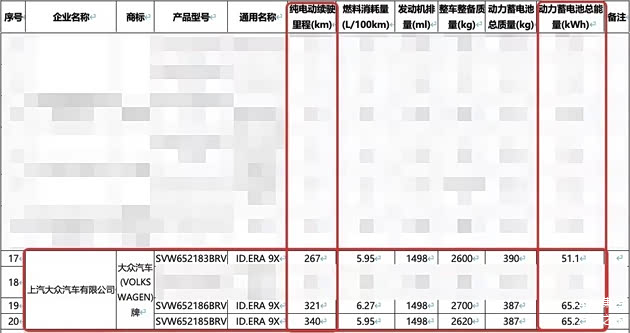 此外,在申报信息中显示,大众ID.ERA 9X的超级增程还将匹配51.5kWh、65.2kWh两种规格电池组,分别能带来267km、340km、321km的WLTC综合油耗,CLTC工况下最长纯电续航可超过400km。在问界M9增程版、极氪9X最长CLTC纯电续航不过310km、380km的情况下,大众ID.ERA 9X能够在这个核心数据方面兑现优势,这回可不是追赶国产新能源,好像还真带来了一些实质性的反超。